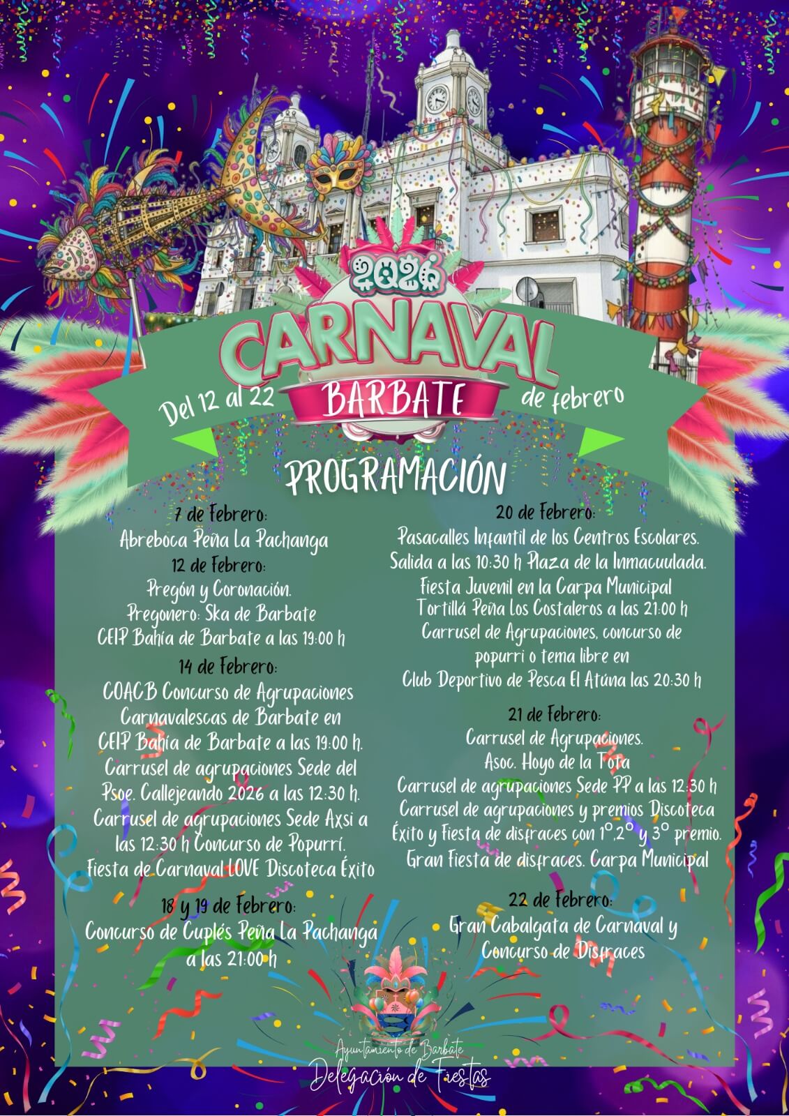 La programación comenzará el 7 de febrero con la Abreboca de la Peña La Pachanga. El jueves 12 tendrá lugar el Pregón y la Coronación, a cargo de la agrupación Ska de Barbate, en el CEIP Bahía de Barbate a partir de las 19:00 h. El sábado 14 se celebrará el COACB (Concurso de Agrupaciones Carnavalescas de Barbate) en el mismo centro a las 19:00 h, además de carruseles de agrupaciones desde distintas sedes desde las 12:30 h y una fiesta de Carnaval por la noche en la Discoteca Éxito. Los días 18 y 19, la Peña La Pachanga acogerá el Concurso de Cuplés a partir de las 21:00 h.