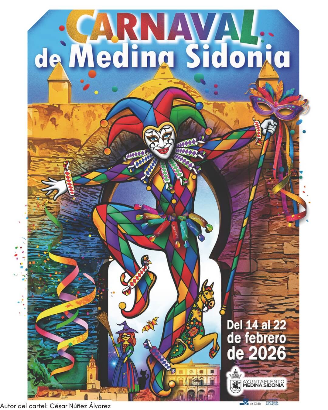 Medina Sidonia vivirá su Carnaval 2026 como una gran fiesta de calle, con pasacalles de disfraces, piñatas, actuaciones de agrupaciones y una programación pensada para familias, peñas y público general. El arranque llegará el sábado 14 de febrero con la Piñata Barriada de la Constitución (13:30 h), la Noche de Carnaval en la Peña Flamenca “Juanito Berrocal” (20:00 h, Caballerizas del Duque) y baile de disfraces en la Carpa Municipal (22:00 h). El domingo 15, el Pregón del Carnaval 2026 será a las 12:00 h en la Carpa Municipal, a cargo de Miguel Ángel Collantes Grimaldi, y desde las 13:30 h habrá degustación gastronómica popular, además de actuaciones de comparsas y chirigotas invitadas y locales.