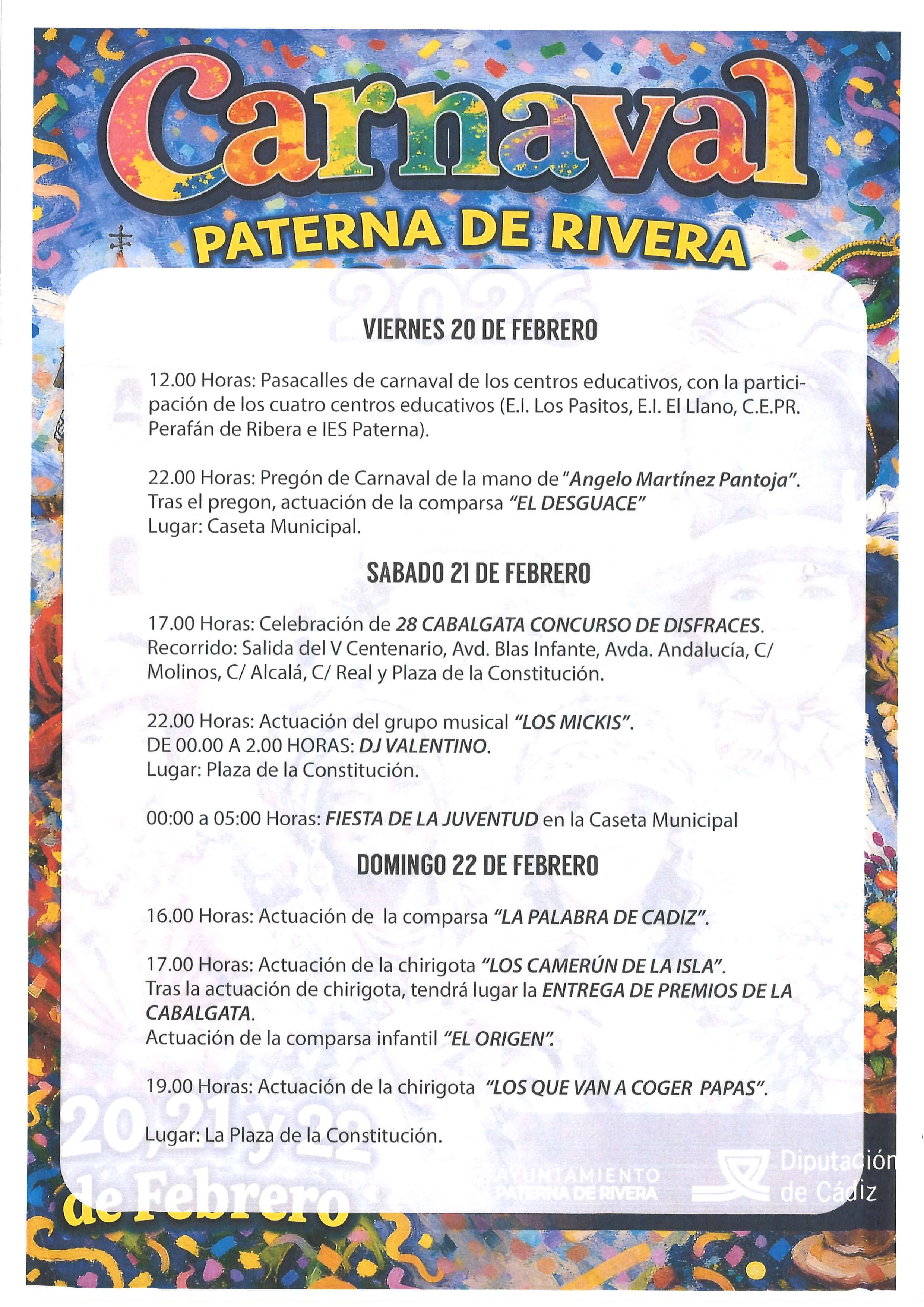 Paterna de Rivera celebrará su Carnaval 2026 del 20 al 22 de febrero con un programa muy centrado en la calle y en la convivencia en torno a la Plaza de la Constitución, combinando pasacalles, pregón, música en directo y la tradicional cabalgata-concurso de disfraces. Será un fin de semana para vivir el ambiente festivo del municipio, con protagonismo para las agrupaciones carnavalescas y propuestas pensadas tanto para familias como para público joven.
