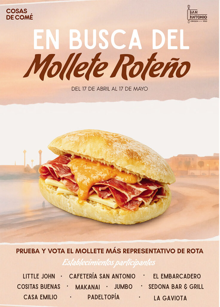 La ruta gastronómica En busca del Mollete Roteño se celebrará del 17 de abril al 17 de mayo como una propuesta para poner en valor uno de los bocados más reconocibles de la oferta local y acercarlo al público a través de una experiencia participativa. La iniciativa invita a probar y votar el mollete más representativo de Rota, reforzando así la conexión entre producto, hostelería e identidad gastronómica del municipio. Cada establecimiento participante elaborará una propuesta propia utilizando obligatoriamente un mollete como base, elaborado por el obrador San Antonio, conocido por sus versiones de este tipo de pan.