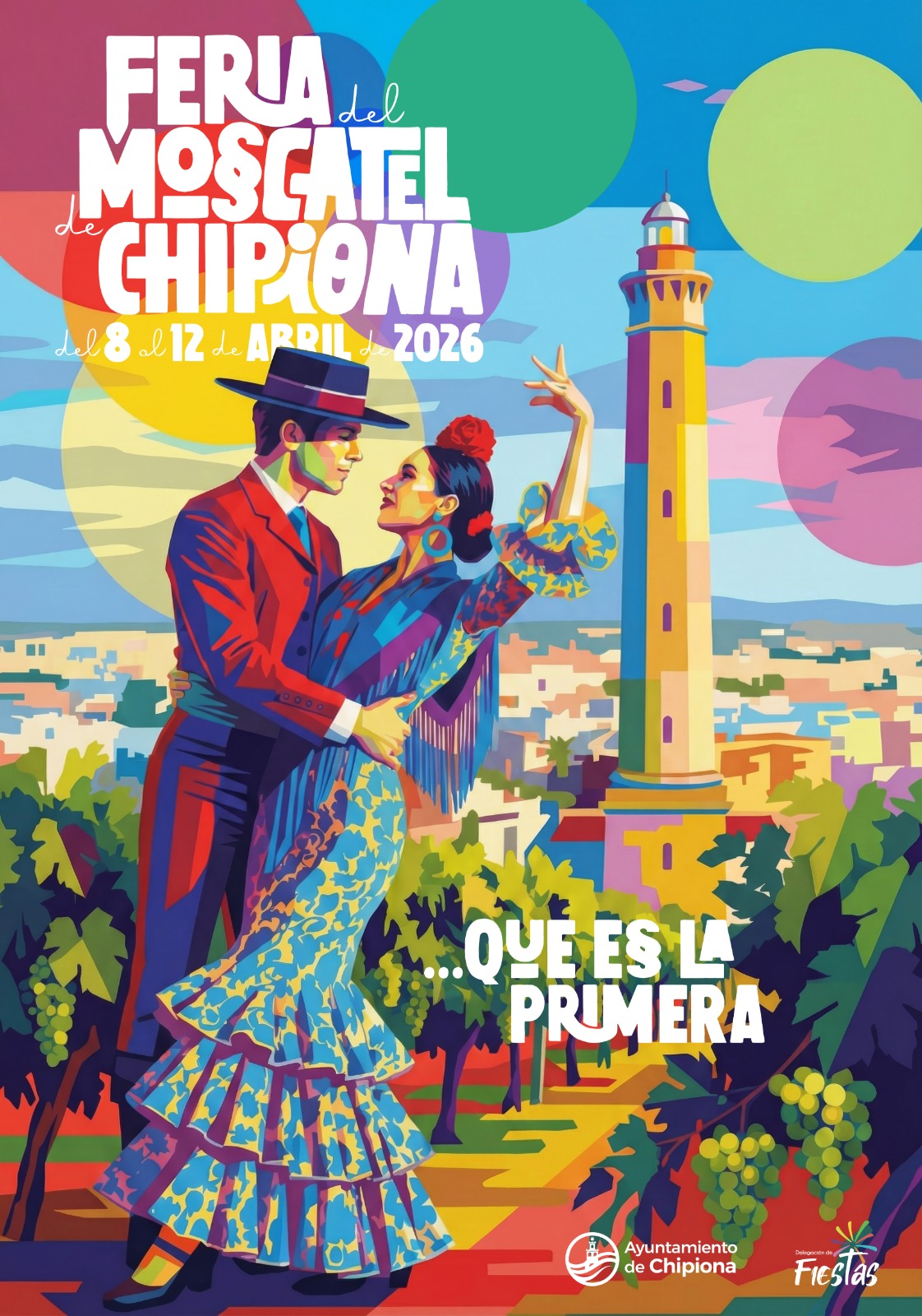 La cartelería oficial sitúa esta edición entre el 8 y el 12 de abril de 2026 y refuerza el protagonismo del moscatel como elemento central de la celebración. La imagen elegida para anunciar la feria conecta además con algunos de los símbolos más reconocibles de Chipiona, integrando referencias al paisaje urbano, al faro y a la estética festiva asociada a esta cita.