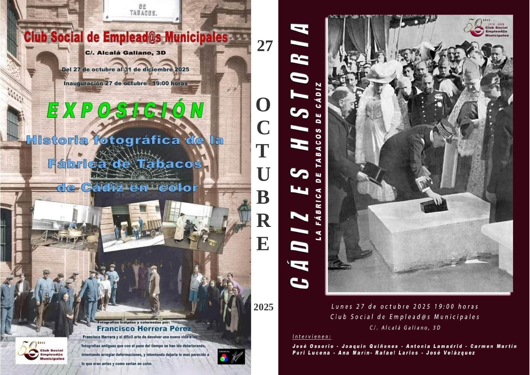 El lunes 27 de octubre de 2025, a las 19:00 horas, el Club Social de Emplead@s Municipales de Cádiz (C/ Alcalá Galiano, 3D) acogerá la inauguración de la exposición “Historia de la Fábrica de Tabacos de Cádiz en color”, con fotografías tratadas y coloreadas por Francisco Herrera Pérez.