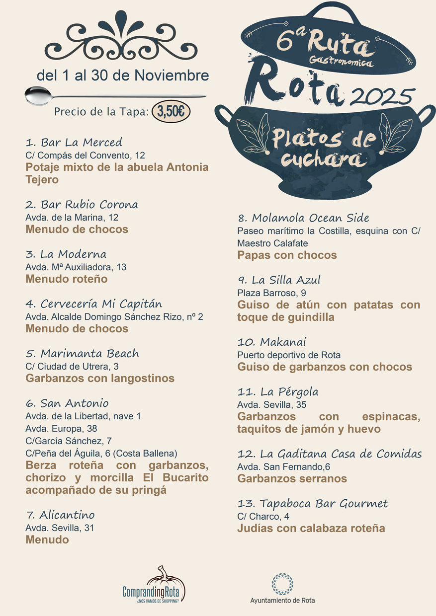 Participan 13 locales con especialidades como menudos, garbanzos con langostinos, guiso de atún con patatas, papas con chocos, garbanzos con espinacas o judías con calabaza roteña, entre otras. La ruta está impulsada por el Ayuntamiento de Rota con la colaboración del comercio local, con el objetivo de dinamizar la hostelería y poner en valor la cocina de cuchara del municipio.