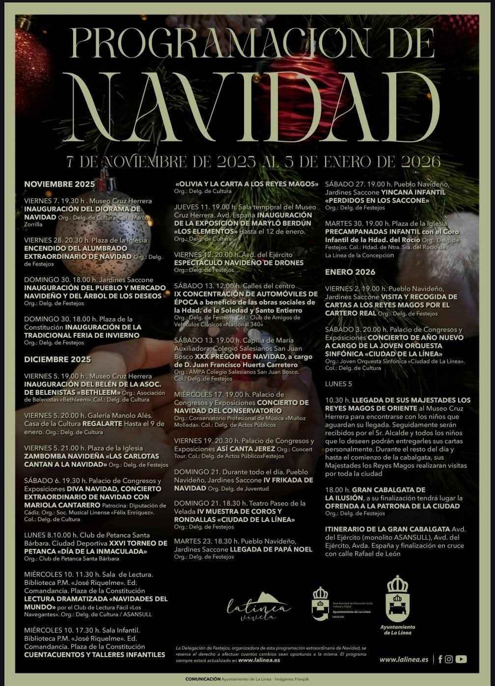 La Línea de la Concepción presenta su “Programación de Navidad” del 7 de noviembre de 2025 al 5 de enero de 2026, con propuestas para todos los públicos: encendido del alumbrado, mercado navideño y árbol de los deseos, dioramas y belenes, zambombas, conciertos, espectáculos (incluido show de drones), citas deportivas y actividades infantiles y familiares en el “Pueblo Navideño” de los Jardines Saccone.