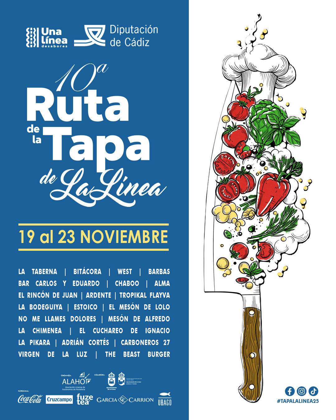 La Línea de la Concepción celebra la décima Ruta de la Tapa del 19 al 23 de noviembre, con 22 bares y restaurantes que presentarán sus creaciones para el voto del público y la valoración de un jurado profesional. La ruta se apoya en el tapaporte, guía disponible en los locales participantes con información de tapas, funcionamiento y programación. El evento refuerza su vertiente social colaborando con la Fundación Márgenes y Vínculos y los ganadores representarán a la ciudad en FITUR.