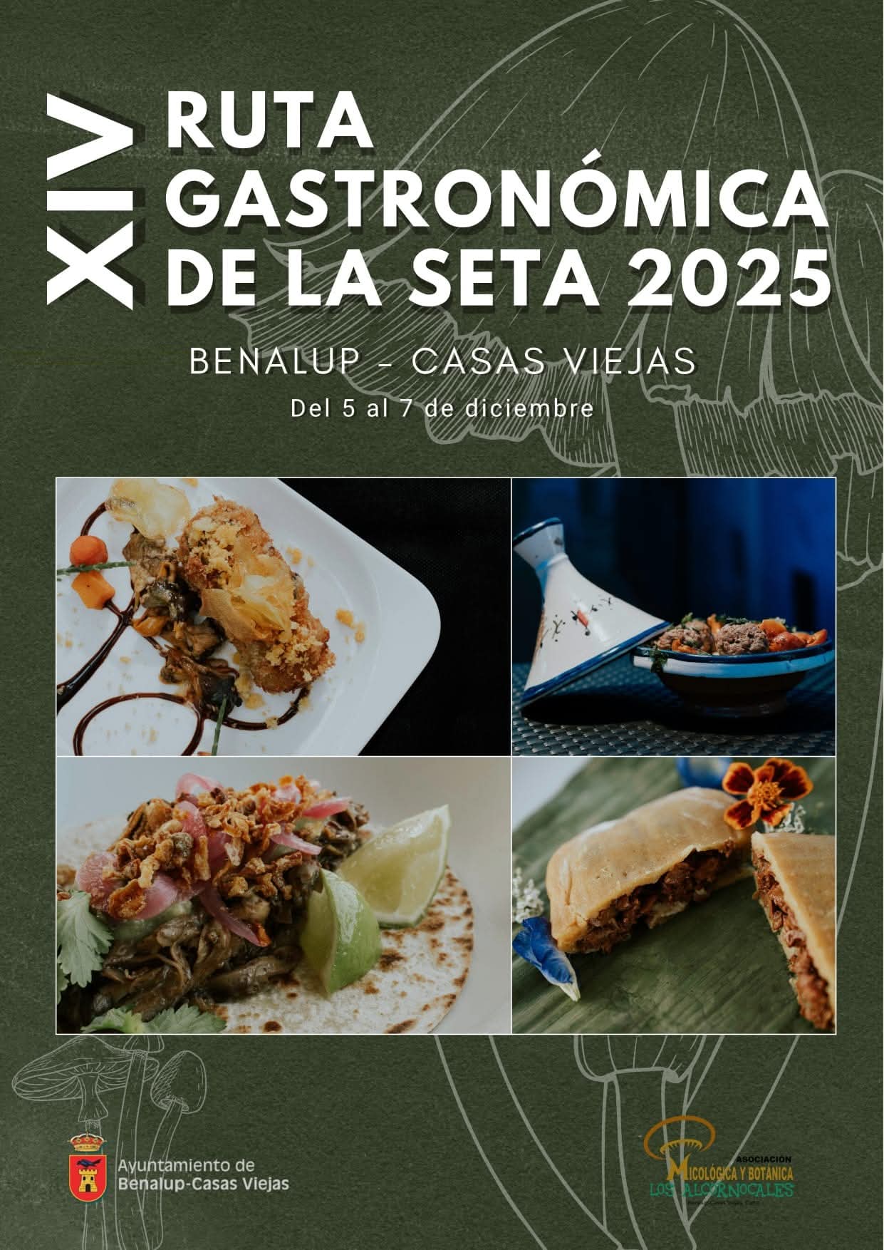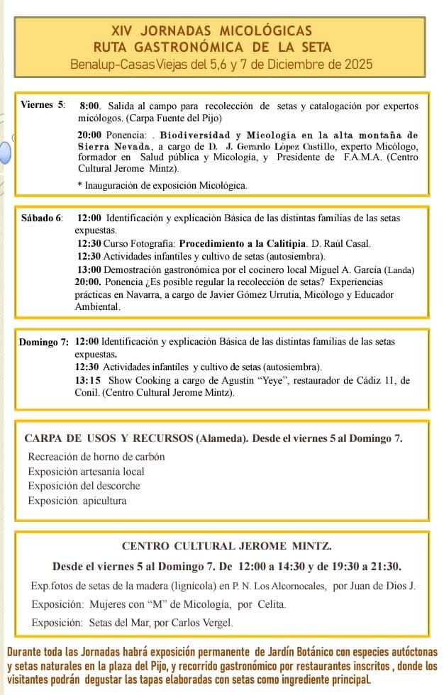 La XIV Ruta Gastronómica de la Seta y Jornadas Micológicas de Benalup-Casas Viejas se celebran del 5 al 7 de diciembre de 2025. El programa combina salidas al campo con expertos para recolectar e identificar especies, charlas de divulgación y demostraciones culinarias que ponen a las setas como protagonistas en los fogones locales. La exposición micológica y las muestras en el Centro Cultural Jerome Mintz completan una propuesta pensada para aprender, degustar y disfrutar en familia.