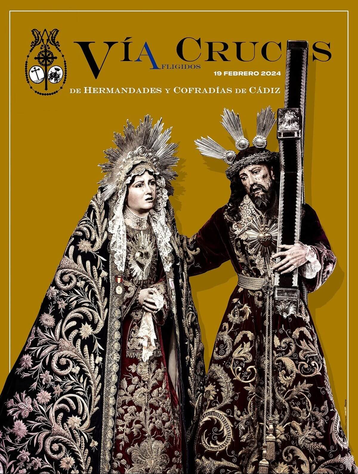 El cartel anunciador del vía crucis ha sido realizado un año más por el fotógrafo y cofrade José María Reyna, que suele encargarse de la cartelería ‘menor’ que edita el Consejo. En esta ocasión, son las dos imágenes titulares de Afligidos, que estarán ambas en la Catedral el primer lunes de Cuaresma, las que protagonizan el cartel, para cuya elaboración el autor ha mezclado trabajos analógicos con otros digitales. De este modo, según cuenta el propio Reyna, a la hora de diseñar este anuncio se ha utilizado “un revelado analógico sobre papel acuarelable”, optando por un llamativo fondo “de pintura acrílica de color mostaza”. “Se ha utilizado tinta fotográfica para manchar la fotografía” y se ha recurrido a la “tipografía digital” para rematar este cartel que fue presentado anoche y que convoca a ese vía crucis del día 19 de febrero.