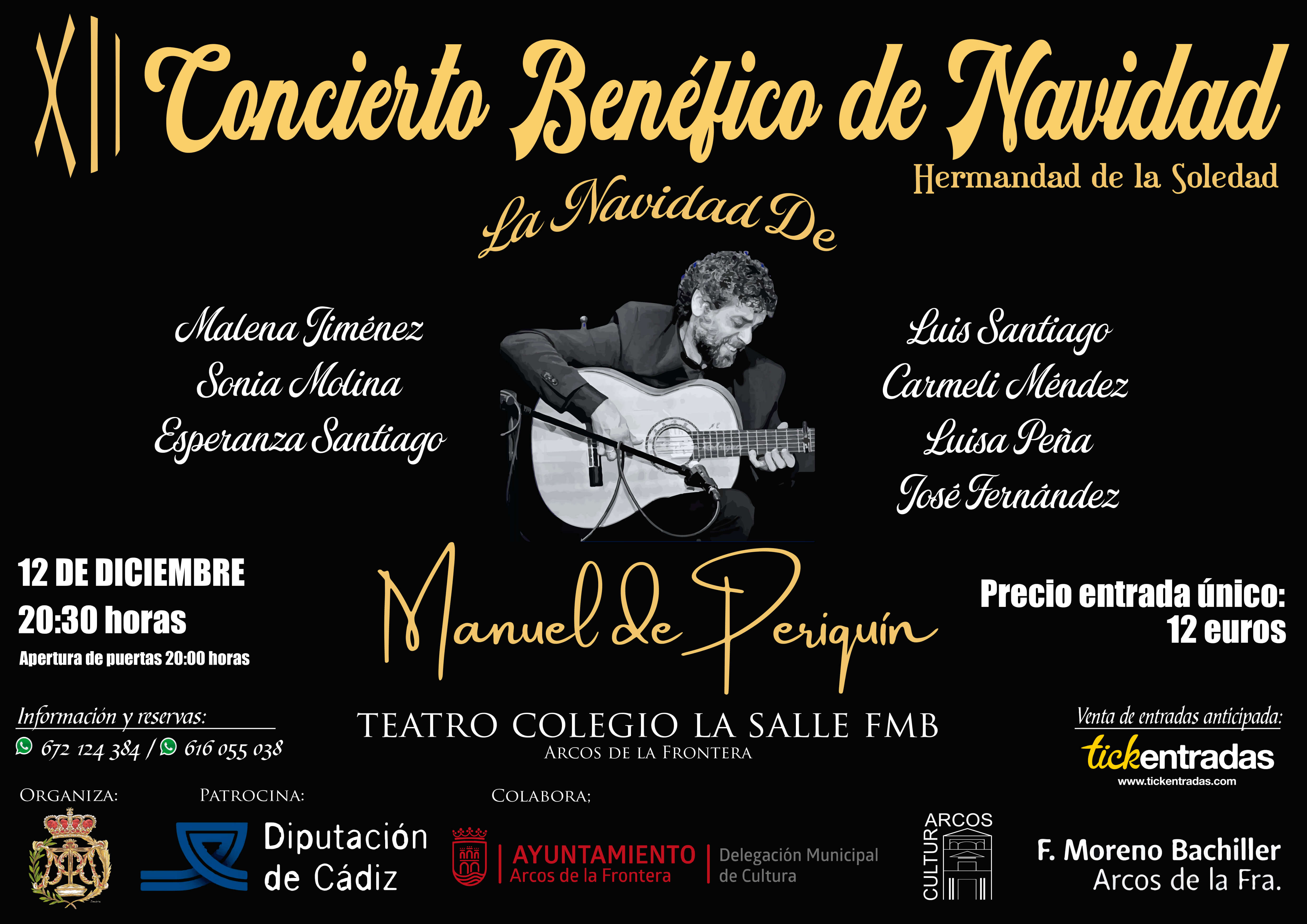 La cita será el viernes 12 de diciembre a las 20:30 (apertura 20:00) en el Teatro del Colegio La Salle FMB de Arcos de la Frontera. Entrada única: 12 €, disponibles a través de miembros de la Junta de Gobierno, en tickentradas.com y en el Bar La Bodeguilla de la Sacristía. Organiza la Hermandad de la Soledad con la colaboración de la Delegación de Cultura del Ayuntamiento de Arcos y la Fundación Moreno Bachiller, y el patrocinio de la Diputación de Cádiz.