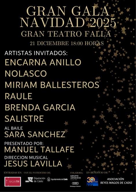 La Gran Gala de Navidad 2025 reunirá música, baile y solidaridad el domingo 21 de diciembre a las 18:00 horas en el Gran Teatro Falla de Cádiz, en una cita que convierte el escenario en un punto de encuentro para compartir ilusión en fechas señaladas. El cartel suma a Encarnita Anillo, Nolasco, Miriam Ballesteros, Raule y Brenda García Salistre, con la participación al baile de Sara Sánchez, la presentación de Manuel Tallafé y la dirección musical de Jesús Lavilla.