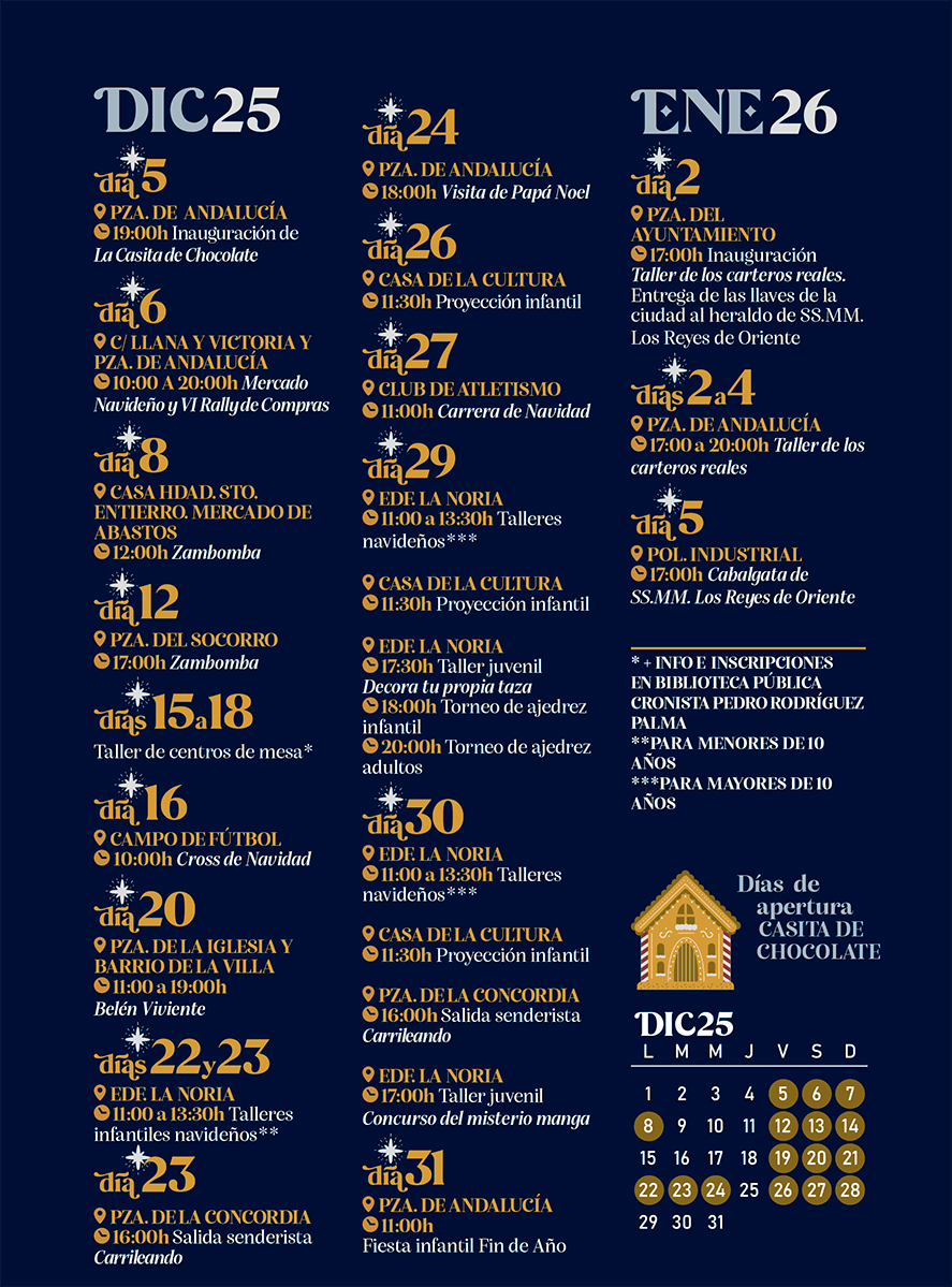 Olvera presenta su Navidad 2025–2026 con actividades para toda la familia: mercado navideño, zambombas, Cross de Navidad, Belén Viviente, talleres infantiles y juveniles, cine familiar, carrera de Navidad y visita de Papá Noel. En enero, el protagonismo será para los Carteros Reales y la Cabalgata de Reyes.