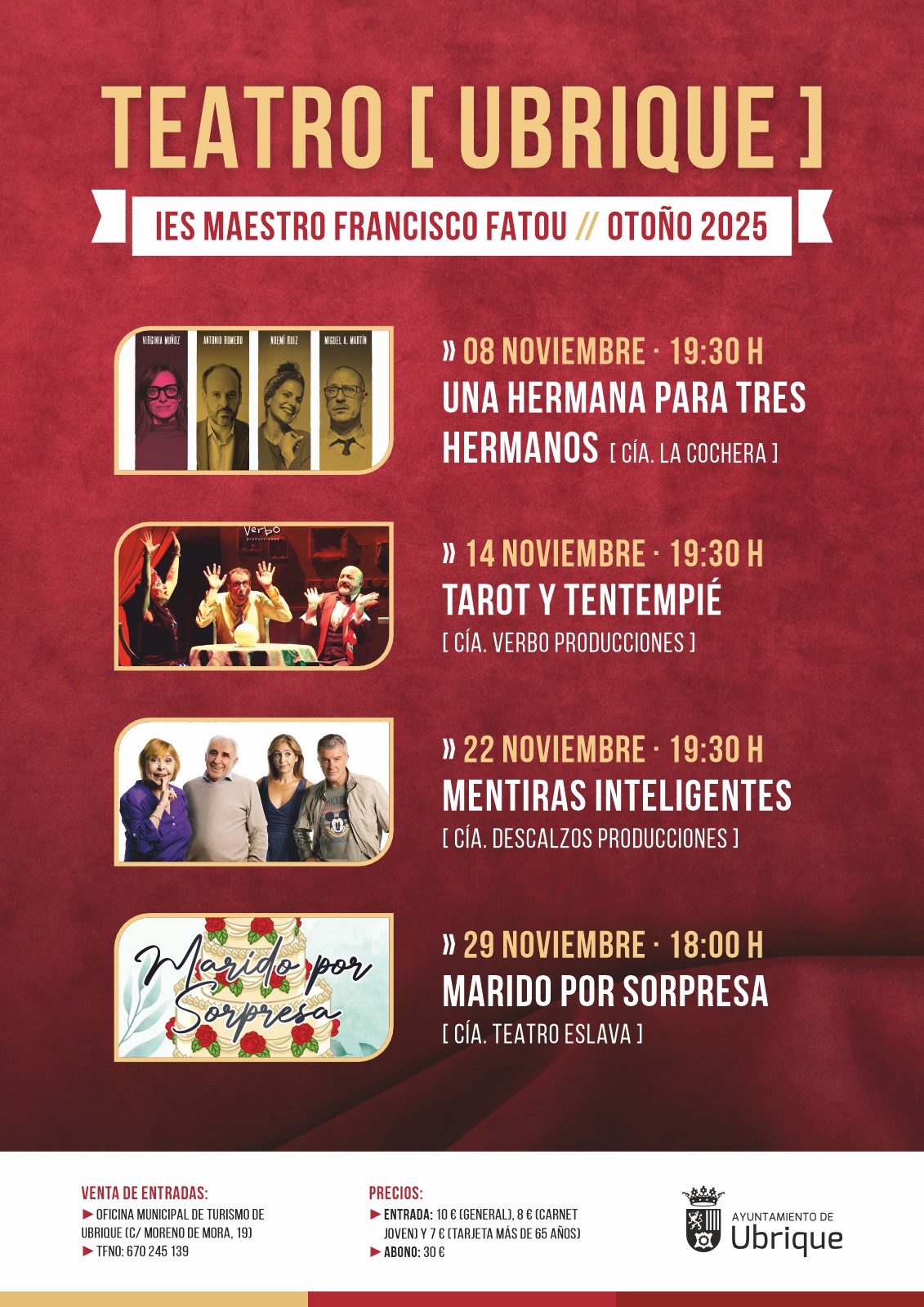 El IES Maestro Francisco Fatou acoge la campaña de teatro de otoño en Ubrique con cuatro funciones en noviembre. El viernes 8 a las 19:30 se representa “Una hermana para tres hermanos” (Cía. La Cochera); el viernes 14 a las 19:30 llega “Tarot y Tentempié” (Cía. Verbo Producciones); el viernes 22 a las 19:30 se presenta “Mentiras inteligentes” (Cía. Descalzos Producciones); y el sábado 29 a las 18:00 cierra “Marido por sorpresa” (Cía. Teatro Eslava).