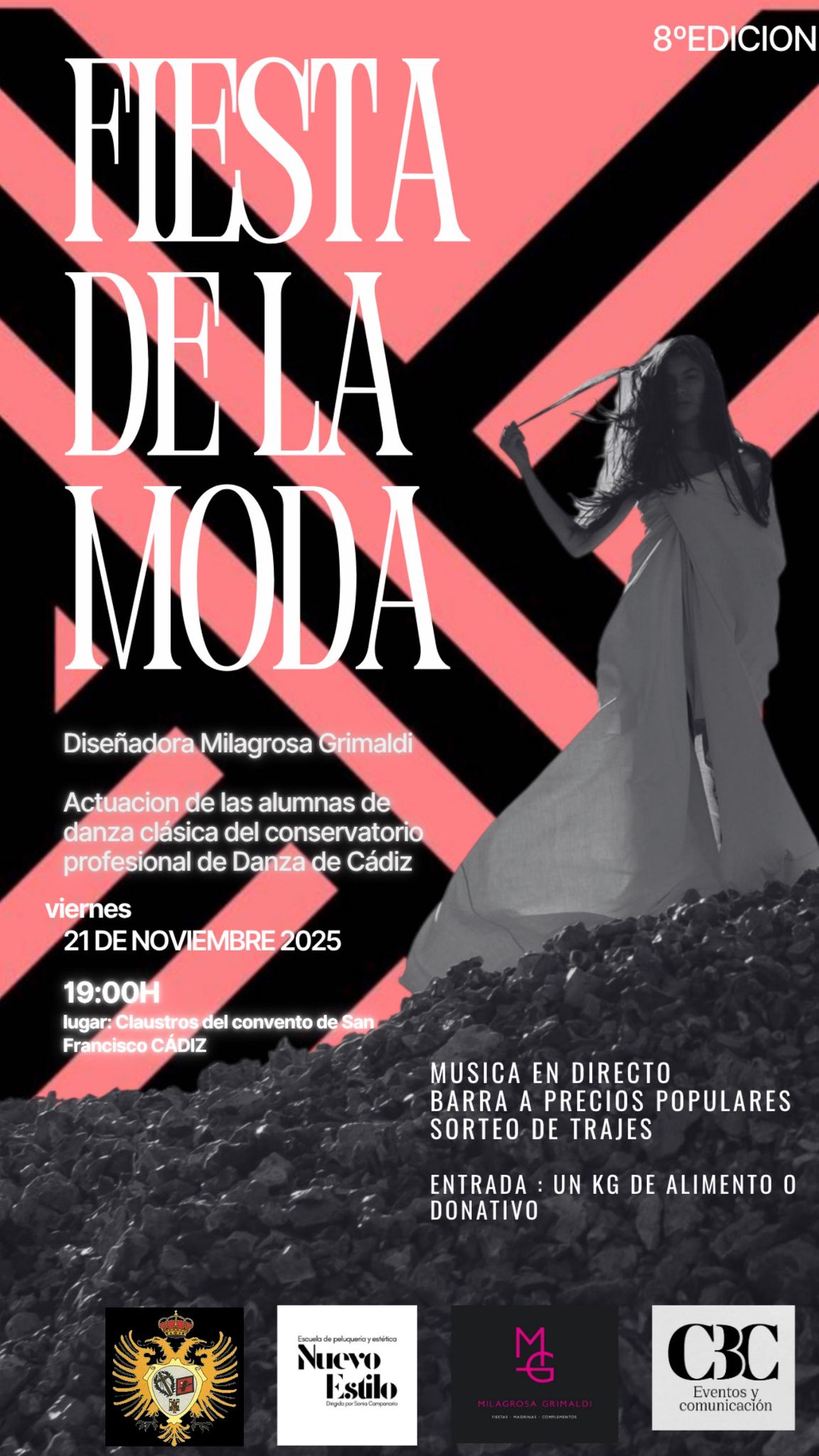 La Fiesta de la Moda celebra su VIII edición con el Desfile Benéfico “Milagrosa Grimaldi”, que por primera vez se traslada a Cádiz capital. La cita será el viernes 21 de noviembre a las 19:00 en el Claustro del Convento de San Francisco, un enclave histórico que acogerá una pasarela centrada en la moda de invitada y fiesta impulsada por CBC Eventos y Comunicación y la firma Milagrosa Grimaldi.