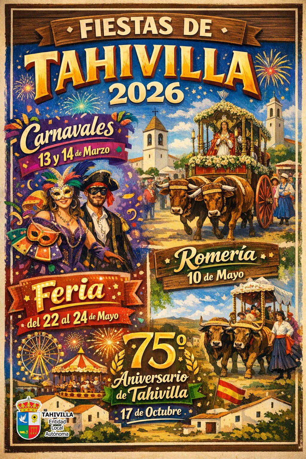 La programación incluye los Carnavales los días 13 y 14 de marzo, la Romería el 10 de mayo y la Feria del 22 al 24 de mayo. Además, el 17 de octubre se celebrará el 75º aniversario de Tahivilla, una fecha señalada para conmemorar la historia local y su identidad. Las actividades se desarrollan en Tahivilla, con ambiente festivo y participación vecinal.