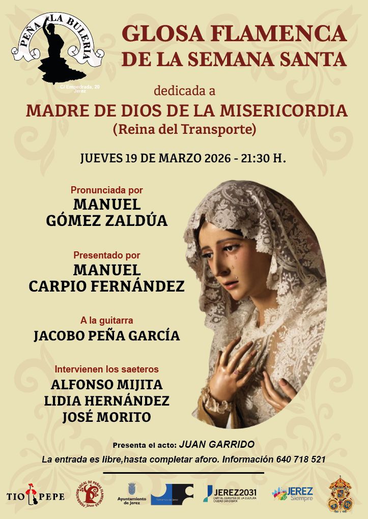 La Glosa Flamenca de la Semana Santa dedicada a Madre de Dios de la Misericordia, Reina del Transporte, se celebrará el jueves 19 de marzo de 2026 a las 21:30 horas en la Peña La Bulería de Jerez. La cita propone un encuentro entre devoción, palabra y cante en torno a una de las imágenes marianas más reconocidas de la Semana Santa jerezana, en un formato que une tradición cofrade y expresión flamenca.