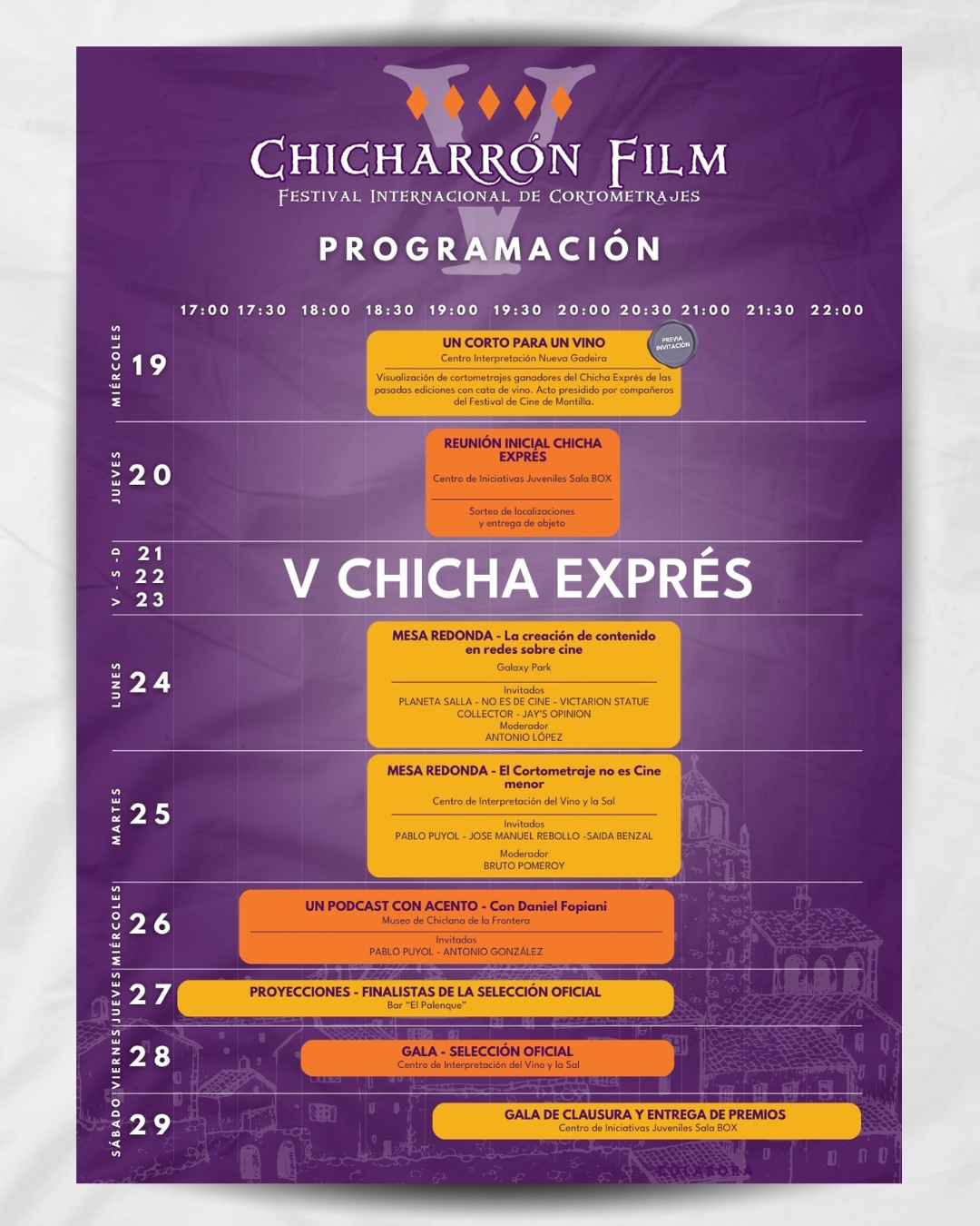 El Chicharrón Film Festival 2025 celebrará su V edición del 20 al 29 de noviembre en Chiclana de la Frontera (Cádiz), con una programación centrada en el cortometraje independiente y nuevas voces del cine. El certamen combina proyecciones, encuentros con equipos y actividades de industria, con una Sección Oficial y el popular Chicha Exprés, el reto de rodaje y montaje en tiempo récord que llena de cine las localizaciones de la ciudad.