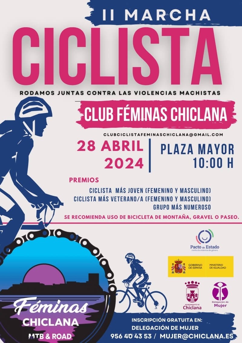 El Ayuntamiento de Chiclana, a través de la Delegación de Mujer y el Club Féminas Chiclana, organiza el próximo domingo 28 de abril la segunda edición de la Marcha Ciclista ‘Rodamos juntas contra las violencias machistas’, que tendrá salida y llegada en la Plaza Mayor. Una iniciativa que tiene como objetivo la lucha contra esta lacra social.
