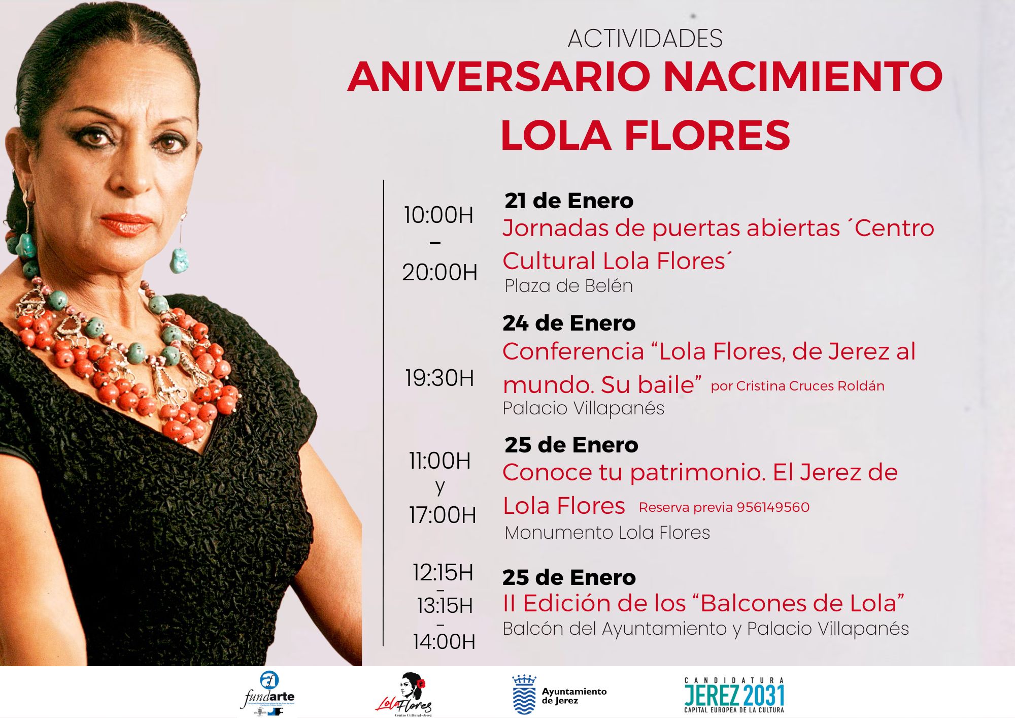 El delegado de Cultura, Francisco Zurita, ha señalado que "este año celebramos el 102 aniversario del nacimiento de nuestra artista más universal, un símbolo de la defensa de valores y de la candidatura de Jerez 2031, Capital Europea de la Cultura, un referente en la defensa de la igualdad y la inclusión; una mujer adelantada a su época que siempre defendió estos valores por encima de todo". Según ha comentado, el ciclo de actividades se inicia con la Jornada de Puertas Abiertas del Centro Cultural Lola Flores, el martes, día 21 de enero, de 10 a 20 horas, con acceso gratuito, que podrá ser visitado por todos cuantos lo deseen.