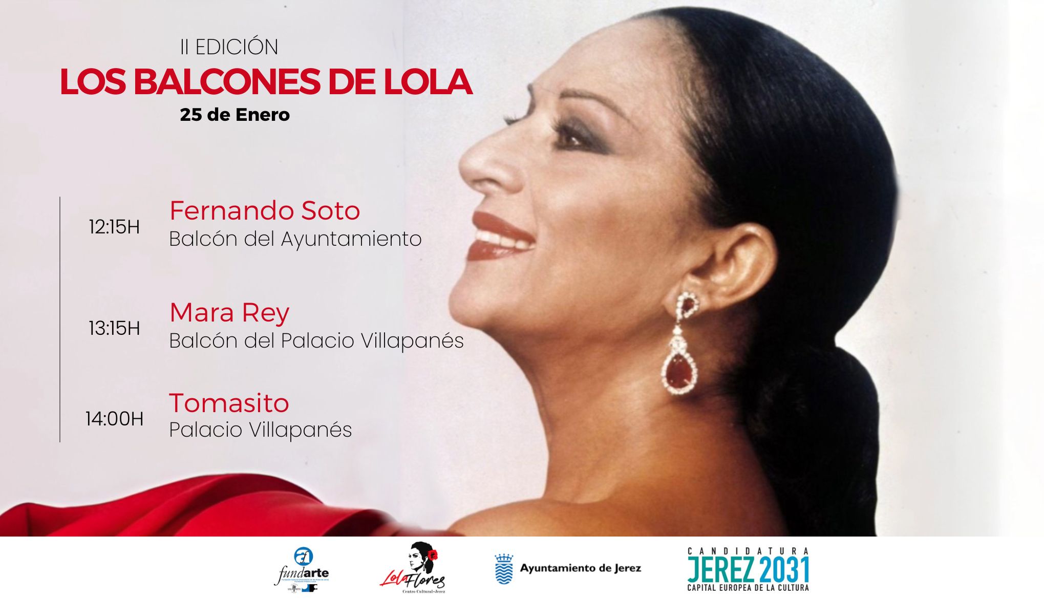 El broche de la programación tendrá lugar el sábado, 25 de enero, con los 'Balcones de Lola'. A las 12.15 horas, será el turno de Fernando Soto, en el balcón del Ayuntamiento, en calle Consistorio. Seguidamente, a las 13.15 horas, tendrá lugar la actuación de Mara Rey, desde el balcón del Palacio de Villapanés, en el barrio de San Miguel, cuna de Lola Flores; y a las 14 horas, también en el Palacio de Villapanés, tendrá lugar la actuación de Tomasito.