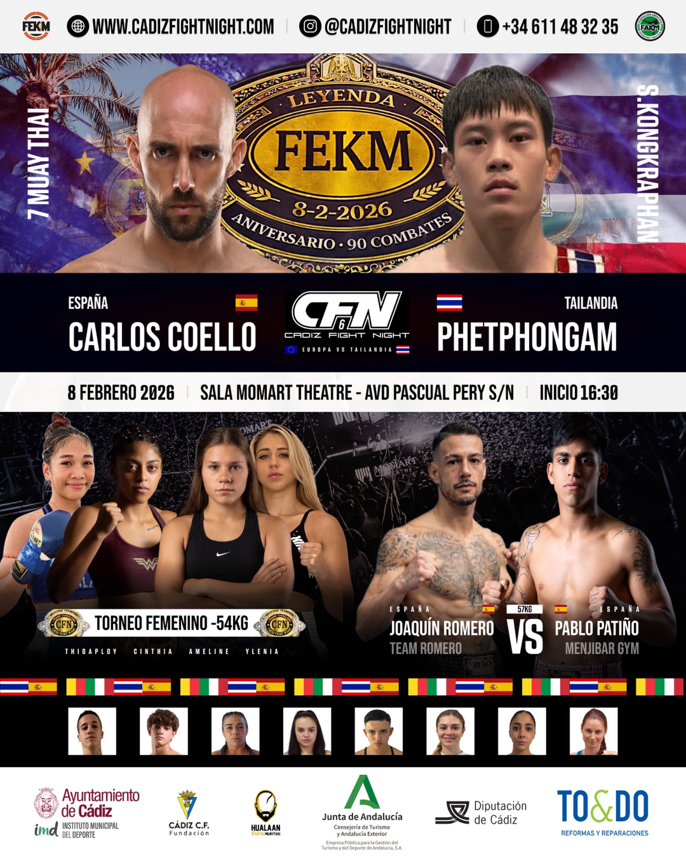 La VI Cádiz Fight Night reunirá en Cádiz a deportistas y aficionados de los deportes de contacto en una velada con presencia de combate masculino y femenino y un marcado carácter internacional. La cita propone un cartel con duelos de alto nivel y el atractivo del formato Europa vs Tailandia, con Carlos Coello y Phetphongam como principales protagonistas.