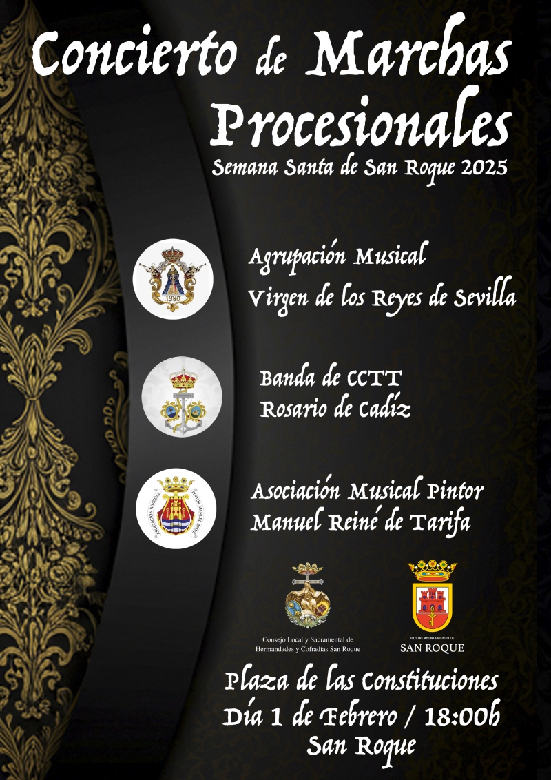 La Plaza de las Constituciones de San Roque será escenario el próximo sábado 1 de febrero de un Concierto de Marchas Procesionales que reunirá a destacadas bandas andaluzas. La actividad, gratuita y organizada por la Delegación de Tradiciones con el apoyo del Consejo Local de Hermandades y Cofradías, comenzará a las 18:00 horas.