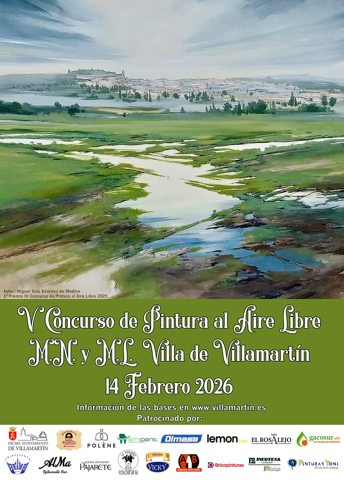 Villamartín celebrará el 14 de febrero de 2026 la quinta edición del Concurso de Pintura al Aire Libre “M.N. y M.L. Villa de Villamartín”, una convocatoria municipal orientada a fomentar la creación artística tomando como inspiración el patrimonio monumental y el paisaje del municipio. Las bases reguladoras y la convocatoria fueron aprobadas en sesión ordinaria de la Junta de Gobierno Local celebrada el 11 de noviembre de 2025, con el objetivo de recuperar el gusto por la pintura del natural y reforzar la sensibilidad hacia la conservación del entorno desde una mirada estética.