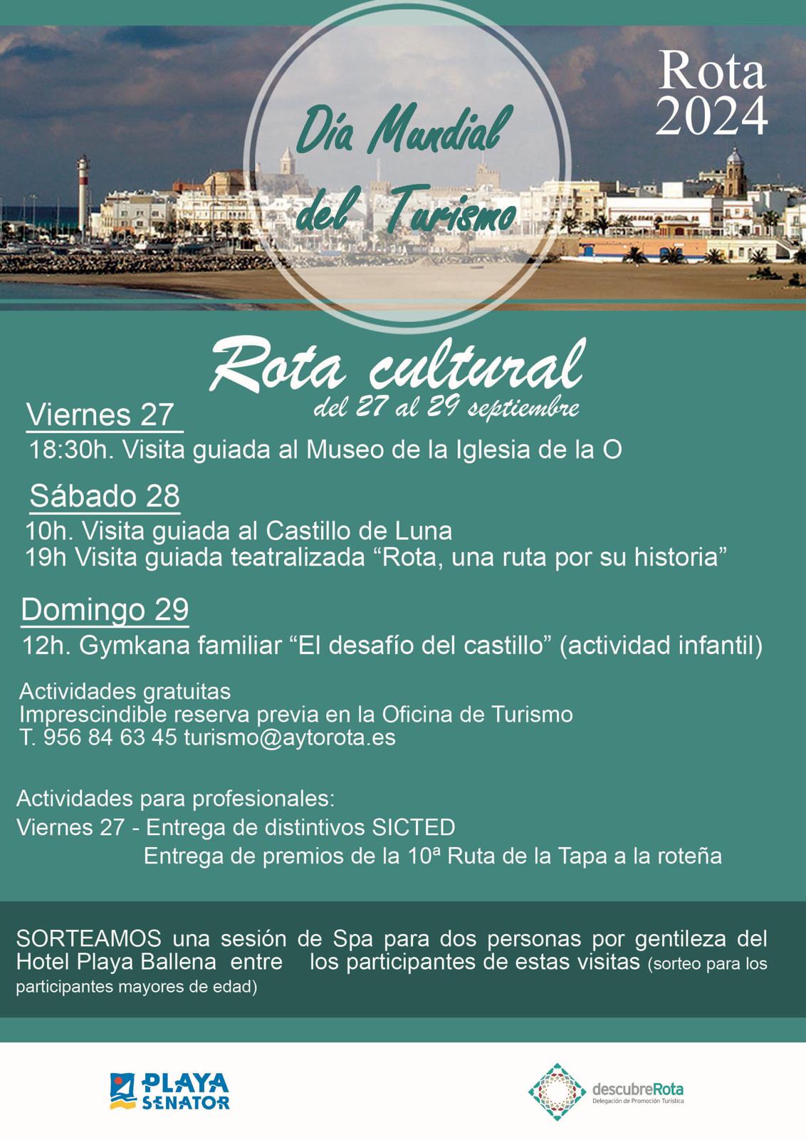 El póximo fin de semana, del 27 al 29 de septiembre, se celebrará en Rota el Día Mundial del Turismo y para ello, se han programado una serie de actividades gratuitas, abierta a todos los públicos, con el fin de facilitar a las personas interesadas que conozcan una parte de la historia y curiosidades de la villa.