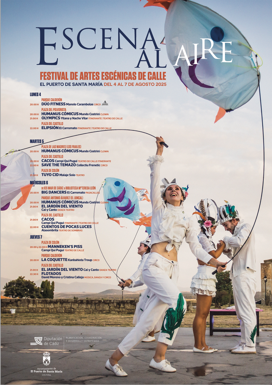 La Escena al Aire de El Puerto de Santa María será el gran festival de artes escénicas de calle del verano 2025, con actividades gratuitas que combinen teatro, circo, danza, marionetas gigantes y espectáculos itinerantes. Se celebrará del 4 al 7 de agosto en distintos espacios emblemáticos de la ciudad como Plaza Colón, Plaza Alfonso X, Parque Calderón y el IES Mar de Cádiz.