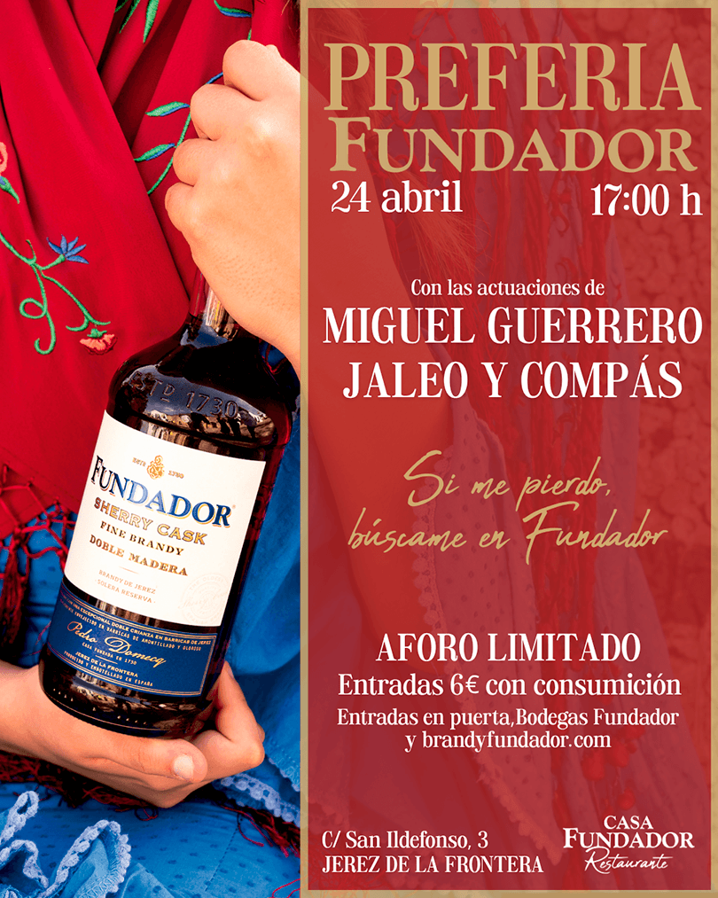 Casa Fundador celebrará el 24 de abril, a partir de las 17.00 horas, una nueva cita para ir entrando en ambiente de feria con una propuesta que combina música en directo, ocio y gastronomía en pleno centro de Jerez de la Frontera. La jornada contará con las actuaciones de Miguel Guerrero y Jaleo y Compás, en un formato pensado para disfrutar del tardeo en un entorno vinculado a una de las marcas más reconocidas de la ciudad.