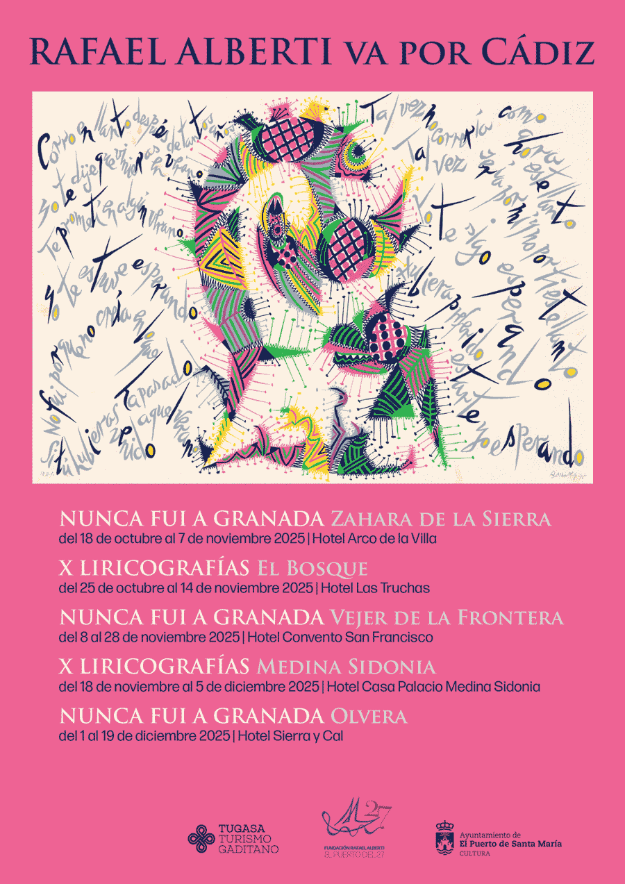 La Fundación Rafael Alberti, en colaboración con Tugasa, impulsa el proyecto “Rafael Alberti. Va por Cádiz”, una exposición itinerante que recorrerá varias localidades de la provincia mostrando parte del legado pictórico del poeta portuense. La muestra reúne dos de sus series más emblemáticas: “X Liricografías” y “Nunca fui a Granada”, realizadas durante su exilio en Argentina e Italia.