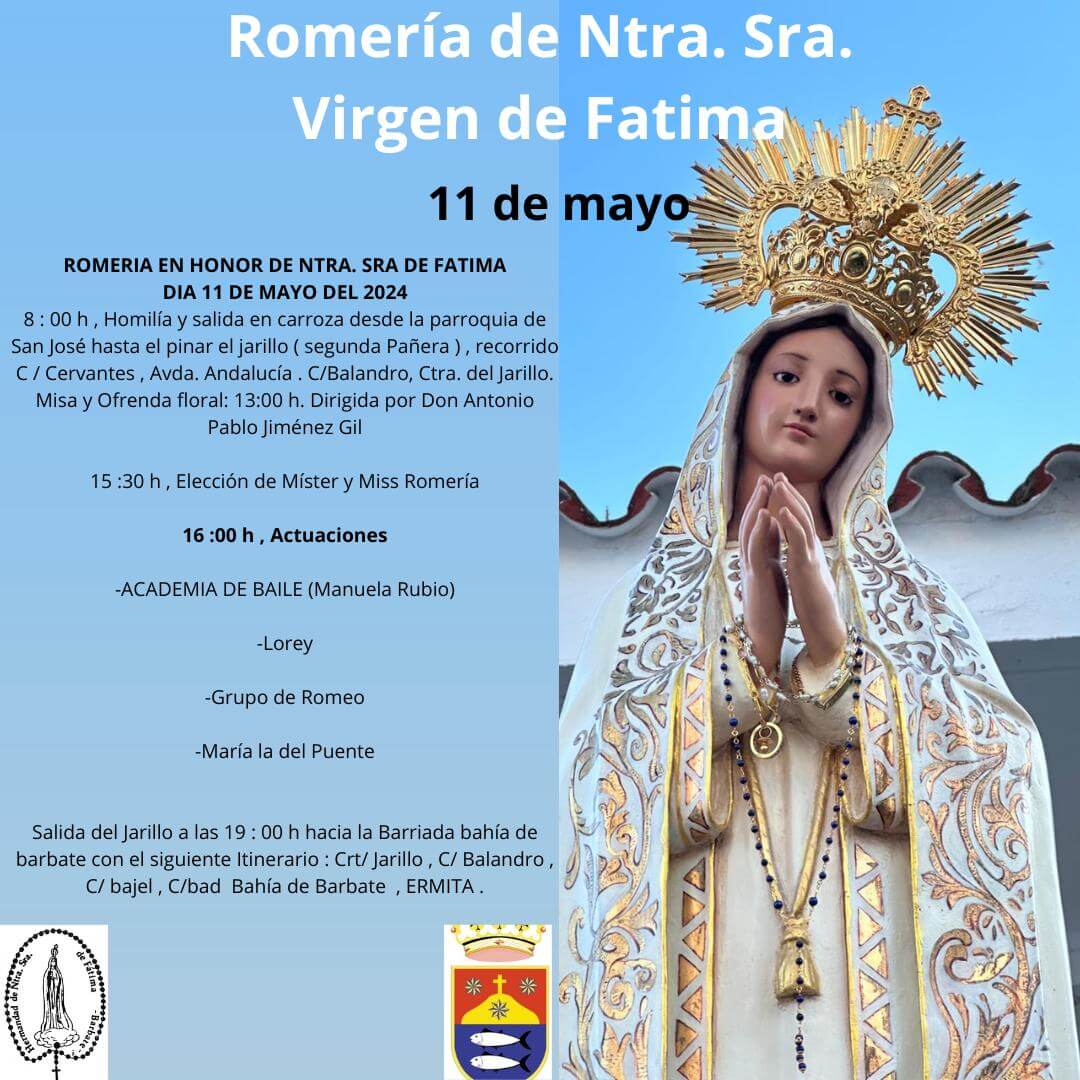 La Romería de Nuestra Señora Virgen de Fátima se celebra el 11 de mayo y contará con la peregrinación hasta el Jarillo, la Elección de Míster y Miss Romería y actuaciones musicales.