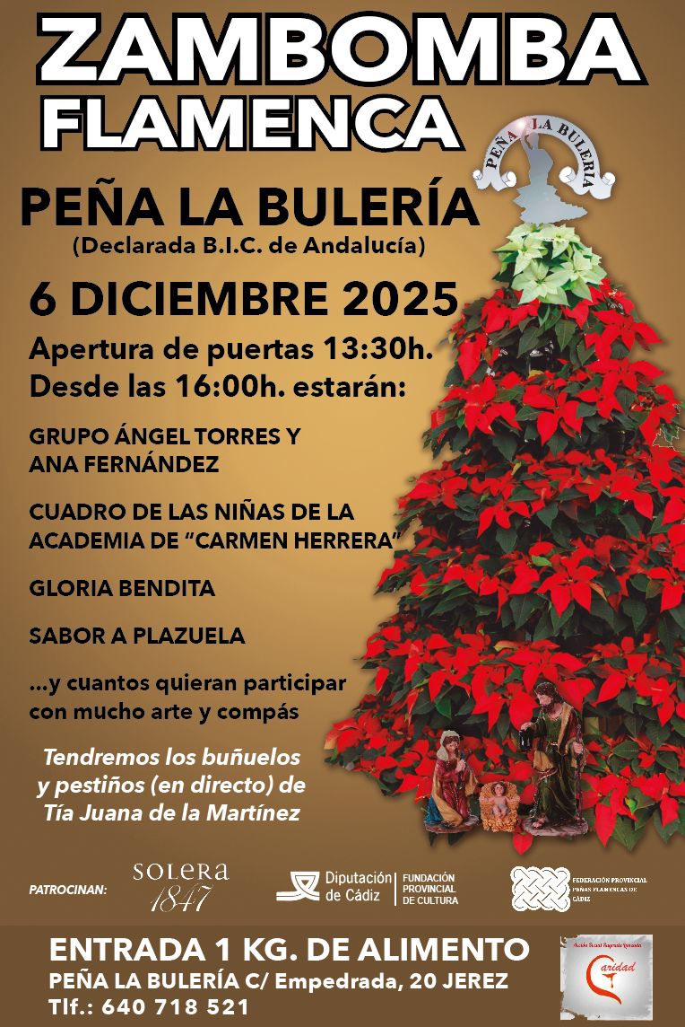 El sábado 6 de diciembre de 2025, desde las 13:30 horas y hasta la madrugada, la Peña La Bulería celebrará su tradicional Zambomba Flamenca, una cita esperada cada año por los amantes del compás jerezano.